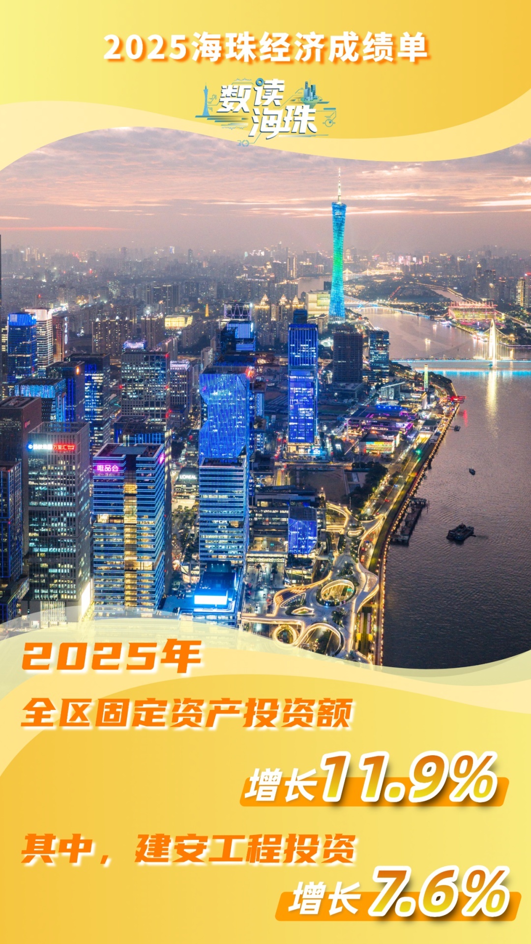 2025年,全区固定资产投资额增长11.9%,其中,建安工程投资增长7.6%。海珠湾隧道工程、腾讯广州总部大楼等大体量工程竣工投产,56个市“攻城拔寨”项目持续发力,完成年度投资计划128.5%。